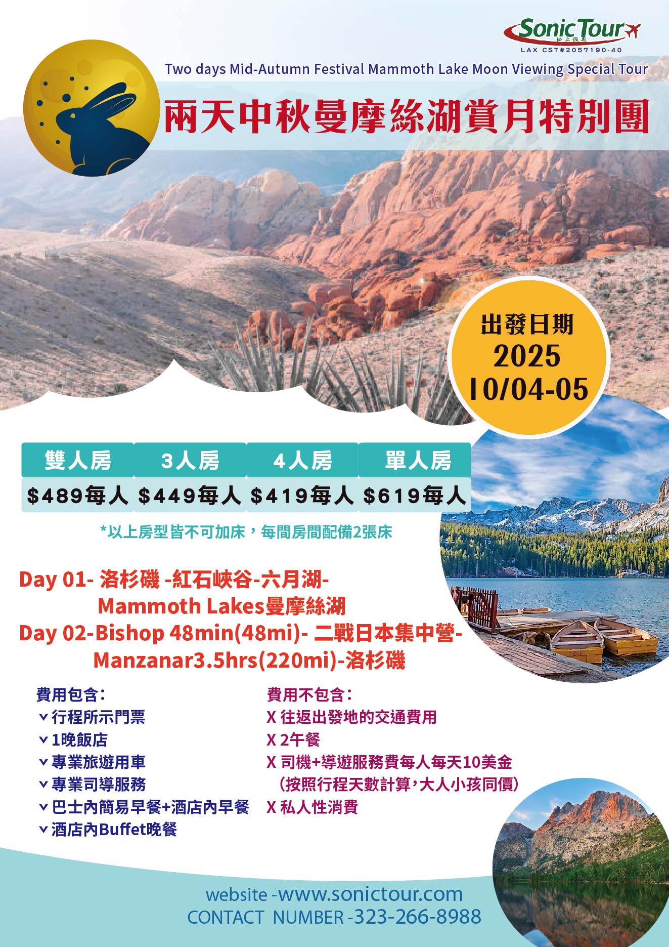 傍晚抵達聞名遐邇的聖地-【Mammoth Lake 曼摩絲湖區】延途松林羅列、風景秀麗的湖泊,有如星羅棋布,萬紫千紅