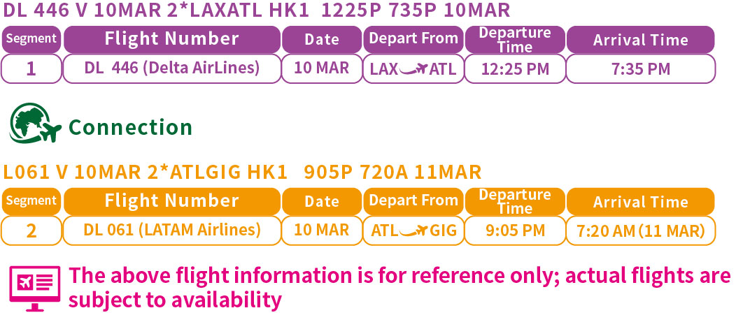 Day 1-Depart from Los Angeles (LAX)→(Connect via ATL)→(GIG)