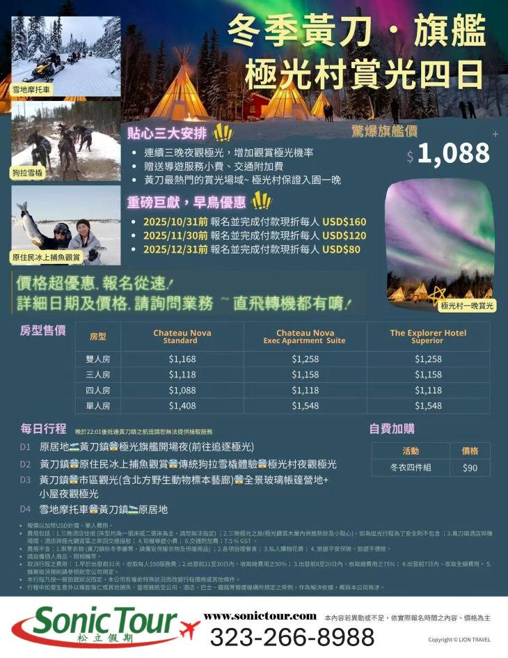 今日白天活動。您可參加黃刀鎮市區觀光、騎乘雪地電單車、狗拉雪橇、西北極地戶外探險...等等。