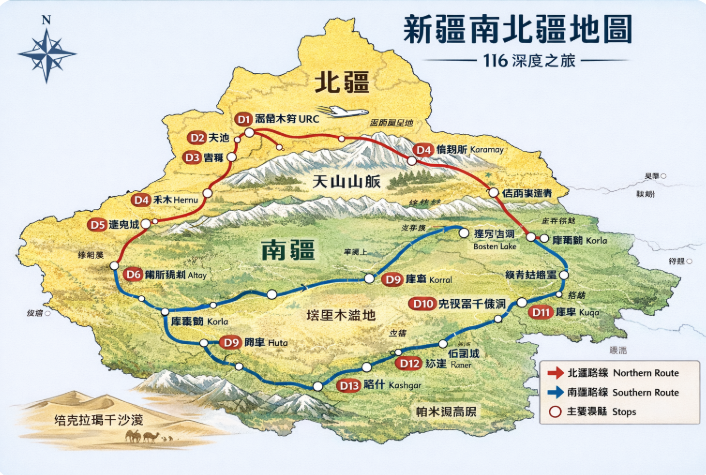 北疆段走進天山天池、阿禾公路、喀納斯、白哈巴與禾木村,雪峰、湖泊、森林與草原交織,如童話般純淨;南疆段深入庫車、和田、莎車、帕米爾高原與喀什老城,感受絲綢之路文明、多民族文化與高原壯闊景色。
